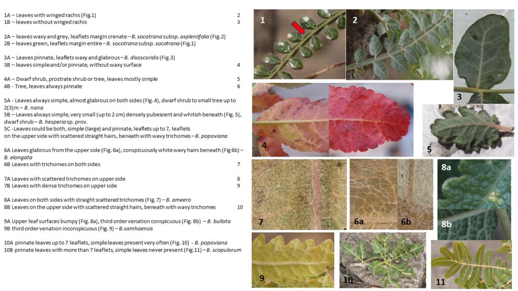Figure. Identification key for Socotran Boswellia taxa Maděra et al. (2024). The key was constructed using only leaves features of mature individuals because they are seen most of the year.