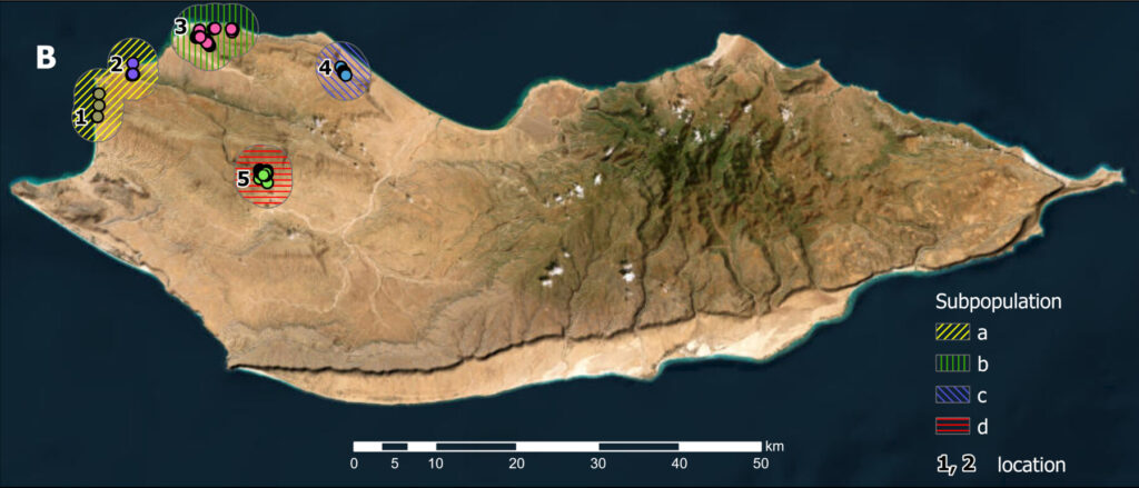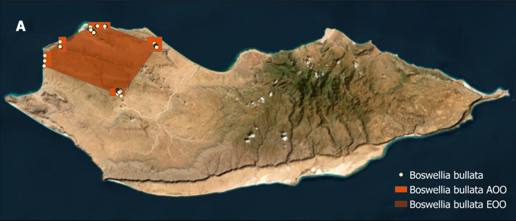 Boswellia bullata is a cliff-rooting species with a severely fragmented distribution. It is limited to the northwestern part of Socotra Island. The species is scattered on steep limestone cliffs and on the top of large boulders in dry, semi-deciduous woodland, at an altitude of 0–582 m, including on cliffs exposed to sea spray. The total AOO is 52 km² and the EOO 350 km². There are four subpopulations in five localities, the largest is situated on the slopes of the mountains near Qalansiyah which counts 197 trees, containing less than half of the total currently inventoried. We consider 4 threat-defined locations (Fig. S3). The total number of trees currently recorded in the island is 491, however we estimate that the total population size could reach 1,000 individuals, as many individuals occur on hardly accessible cliffs and are difficult to see. In some subpopulations, a few juvenile trees and seedlings were observed. However, local cyclones in 2015 and 2018 destroyed many adult trees, for example near Qalansiyah. All individuals of B. bullata are found within 2 km of the coast, and on slopes of high inclination (median around 40 degrees).