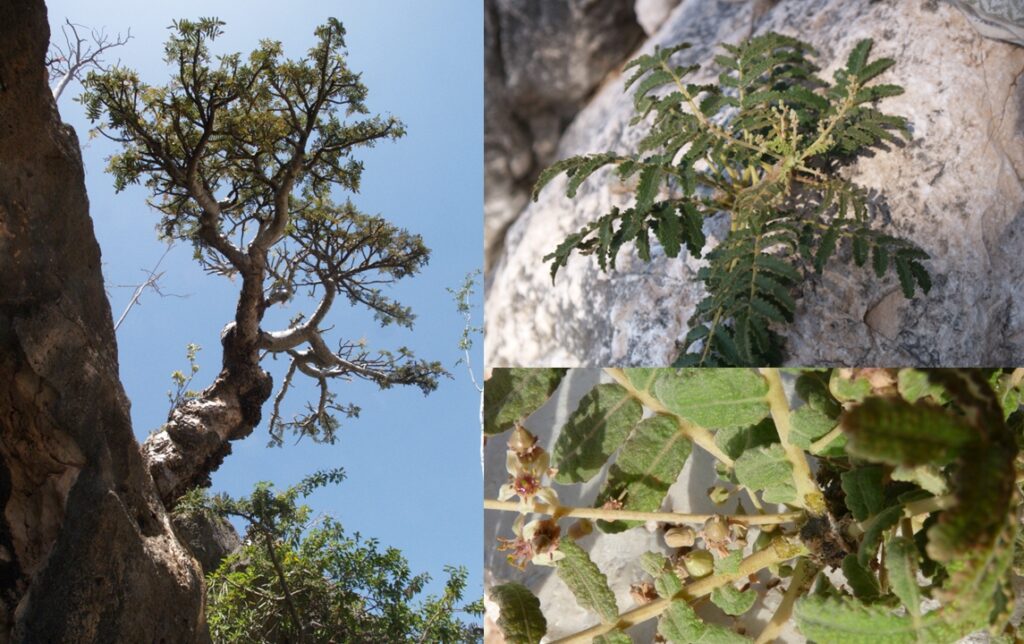 Boswellia bullata is an endemic species on Socotra Island. The tree trunk has a light brown or grey colour with paper-like flakes. Leaves grow in shoot apices, alternate, imparipinnate with 9-19 leaflets, 7-17 cm long. Flowers are cream yellow to light green colour.