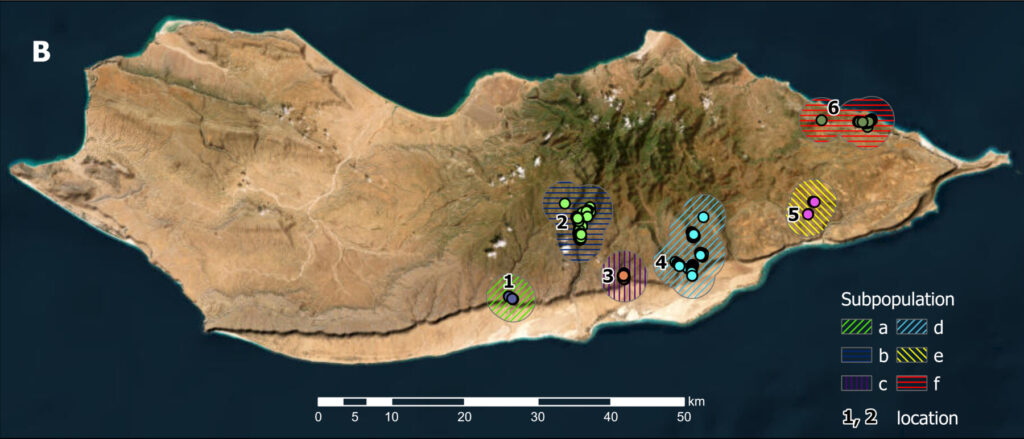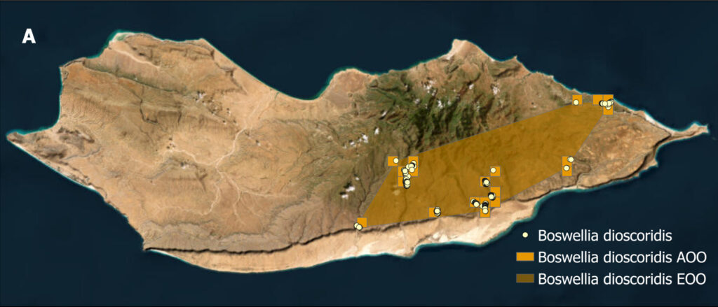 Figure. A: Recorded trees, AOO and EOO; B: subpopulations and localities of Boswellia dioscoridis in Socotra Island.