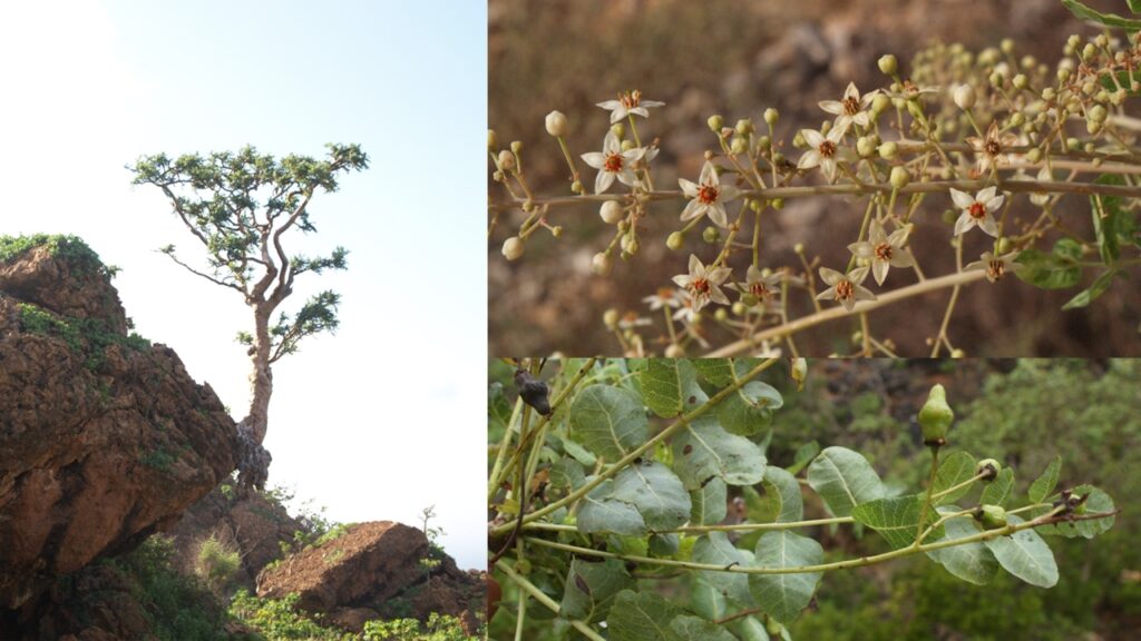 Boswellia dioscoridis is an endemic tree on Socotra Island, growing up to 7 meters with a yellowish-brown trunk and leaves densely placed in shoot apices, imparipinnate ovate-oblong, 12-40 leaflets, 8-30 cm in size, finely pubescent at the veins. Flowers are cream to yellow, sometimes pink in colour and fruits are 3-5 locular. B. dioscoridis is the only tree on Socotra Island with glabrous leaves and inflorescence.