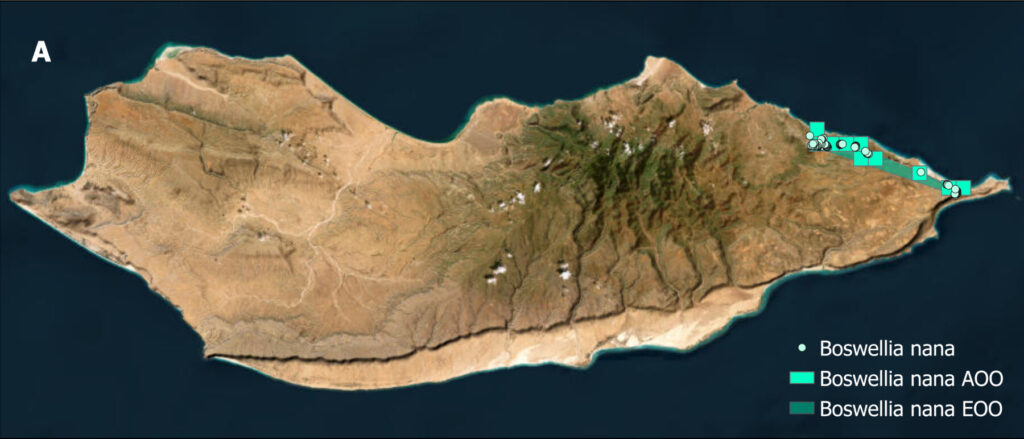 Boswellia nana is a very rare endemic of Socotra Island, growing exclusively on limestone cliffs in dry, semi-deciduous woodland. It is restricted to the northeast of the island where it occurs at altitudes between 226 and 710 m on steep cliffs (median 45° slope). The AOO and EOO are 40.0 km². We found B. nana at seven localities, which correspond to two different subpopulations. The species is found from the Hamadero highland to the most eastern part of the island (with a disjunct subpopulation at the northern sea-facing cliffs at Riy di Irisseyl). As the species occurs in a very limited geographical area and narrow altitudinal zone on the north-facing eastern limestone cliffs of Socotra Island, a single (e.g., drought or disease) event could affect the entire species, therefore there is only one threat-defined location. The largest population is near Erher cliffs where 118 specimens have been counted. Due to the inaccessible terrain and the cliff-growing ecology of the species, the number of individuals (354 individuals are currently known) is likely an underestimation, and the total number could reach ca. 700 individuals. Mostly the species is known as a small dwarf form, but towards the eastern extreme at Irisseyl we also observed actual trees (these are under investigation).