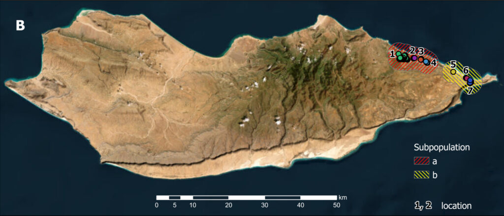 Figure. A: Recorded trees, AOO and EOO; B: subpopulations and localities of Boswellia nana in Socotra Island.