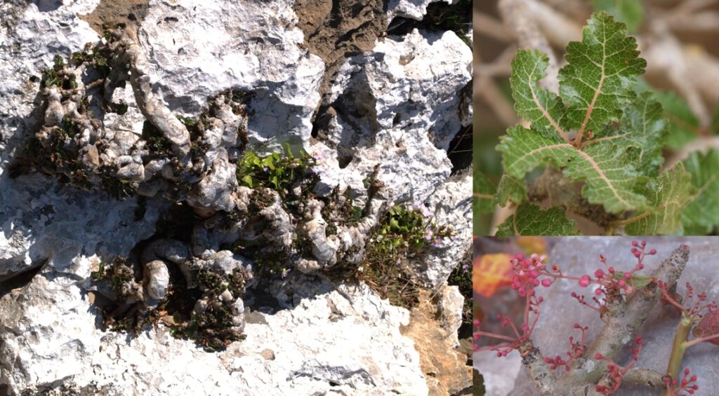 Boswellia nana is an endemic species on Socotra Island. The name “nana” refers to the habit of the tree, up to 2 m in total. The trunk is grey, often covered by crustose lichen (Pullaiah et al., 2023). Leaves are simple, 4 cm in size, irregularly crenate-undulate, and densely crowded in shoot apices. Pink or reddish, glabrous flowers grow in unbranched inflorescence. Fruits are 3-4 locular capsules.