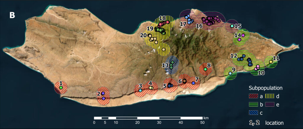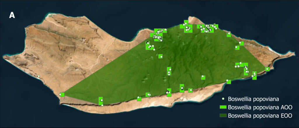Figure. A: Recorded trees, AOO and EOO; B: subpopulations and localities of Boswellia popoviana in Socotra Island.