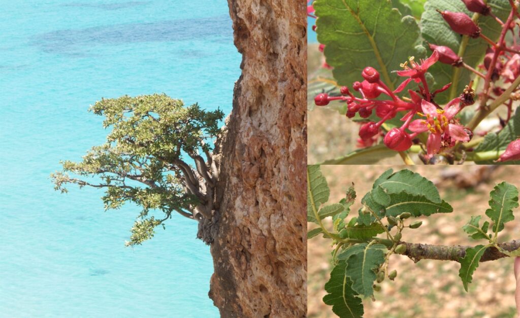 Boswellia popoviana is a cliff-growing species with a scattered and strongly fragmented distribution; it is relatively widespread on mostly sea-facing steep limestone cliffs and along several valleys penetrating far into the centre of the island (Fig. S8), at a wide altitudinal range of 13–987 m. The AOO is 204 km² and the EOO is 1,879 km². We recognize five subpopulations containing 20 localities, which occur in five threat-defined locations. Many of the stands of B. popoviana consist of only a few individual overmature trees and we can consider several sites as nearly extinct.