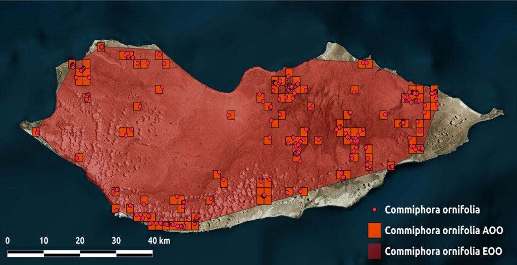 Figure: AOO and EOO of Commiphora ornifolia showing the area of distribution of this endemic species
