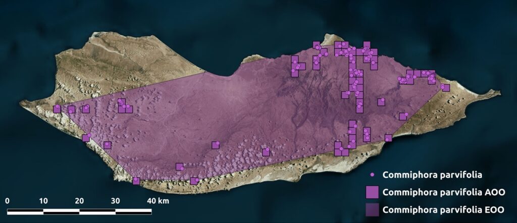 Figure: AOO and EOO of Commiphora parvifolia showing the area of distribution of this endemic species
