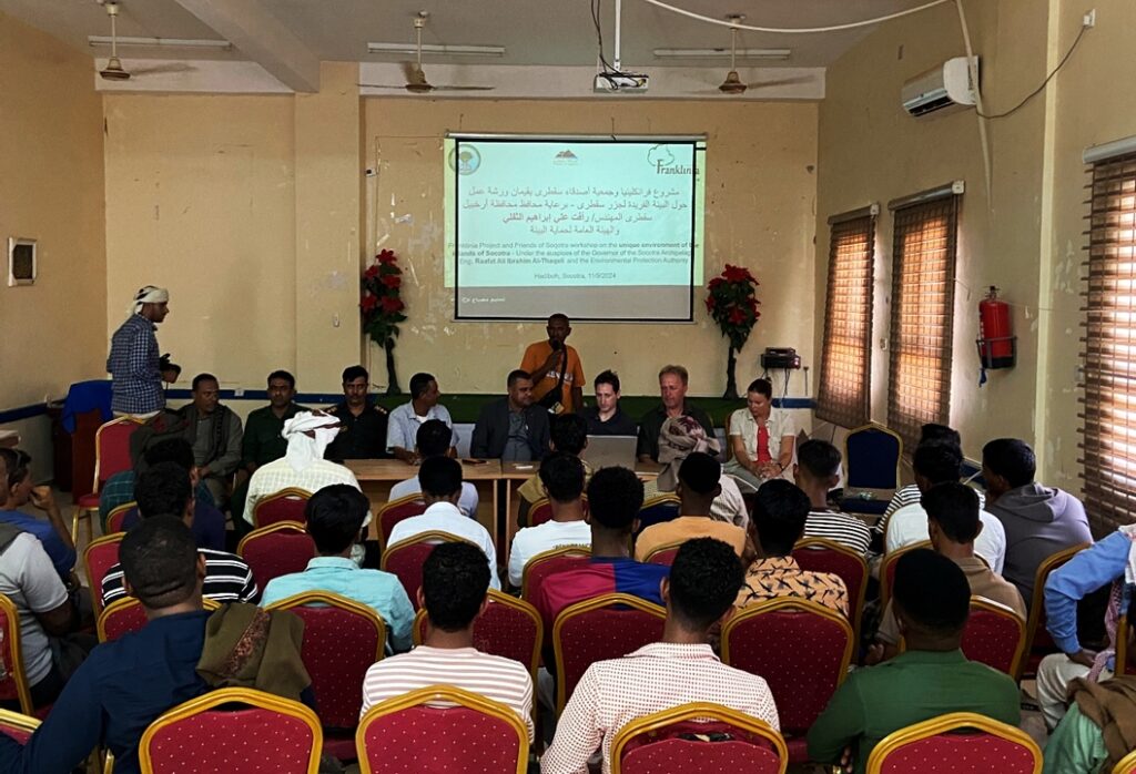 In September 2024, the project team organised a large event engaging ecotourism guides to discuss the importance of nature conservation in Socotra and the team discussed examples of illegal collection of endangered species, with emphasis on endangered trees. This event, organised at the Kuwait College in Hadiboh on the 11th of September, 2024, included local authorities and a large number of tourist guides from various local tourism agencies on Socotra. Local authorities were represented by the head of the ministry of tourism (Socotra Branch), the Deputy Governor, the chairman of EPA, head of the Socotra police, and head of local security. The initiative included presentations about the project, as well as presentations about the importance of safeguarding the environment, and interactive discussions and question-answer sessions with all participants. The engagement was very high and the meeting was highly constructive, and needed, as tourism is strongly increasing on Socotra, but disconnecting too often from actual sustainable ecotourism. Therefore, this kind of awareness meetings are key for local conservation.